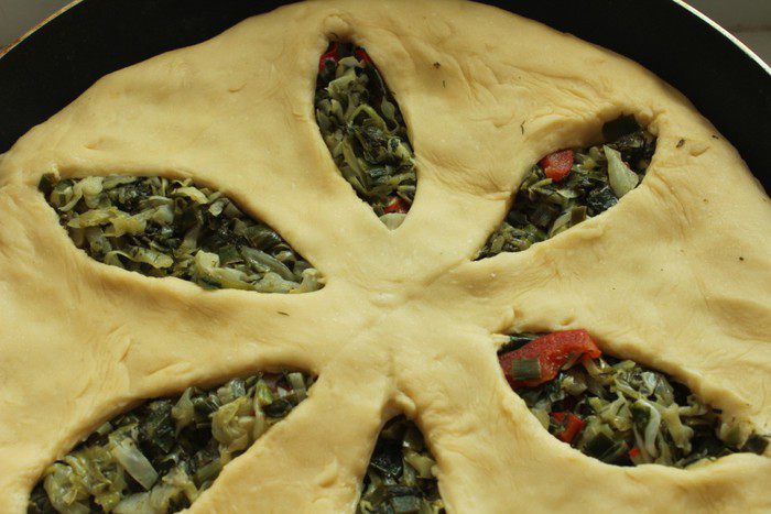 Накрыть вторым коржом, соединить края. На верхнем корже сделать фигурные вырезы. Смазать верх яйцом и выпекать при Т 180 градусов 40-45 минут.