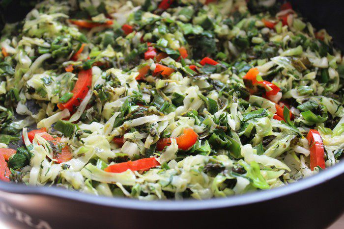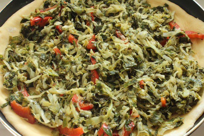 Разогреть в сковороде растительное масло. Выложить капусту с зеленью и жарить на среднем огне примерно 5-6 минут, пока не выпарится лишняя жидкость. Приправить солью и сахаром. Охладить.