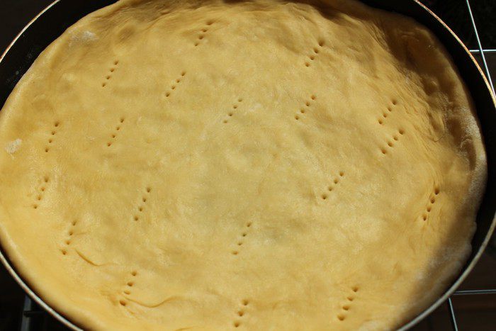 Тесто разделить на 2 части. Раскатать два коржа толщиной 0,5 см. Один корж выложить на противень (или в форму), сделать наколы вилкой.