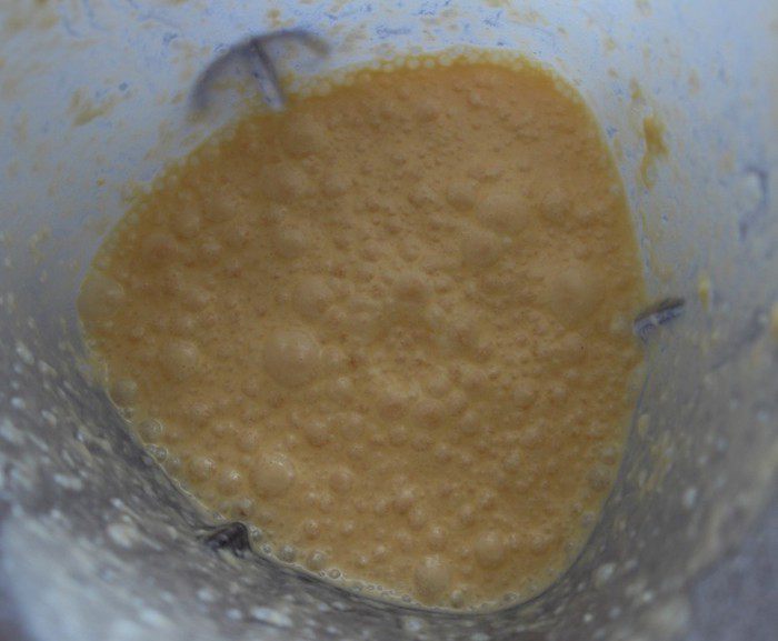 Сливочное масло взбить в блендере до пышности. Не прекращая взбивать по одному добавить яйца. Взбить до однородности. (Оставить немного яичного белка для смазывания пирога перед выпечкой).
