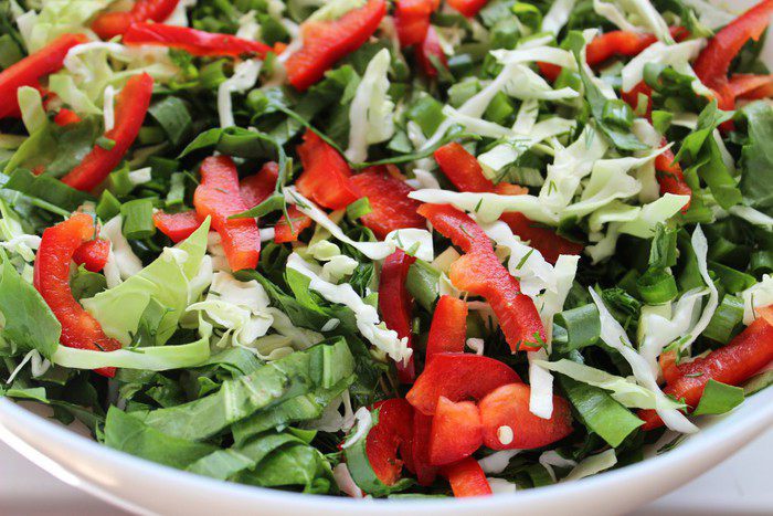 Соединить капусту, зелень и порезанный болгарский перец, добавить рубленый чеснок.