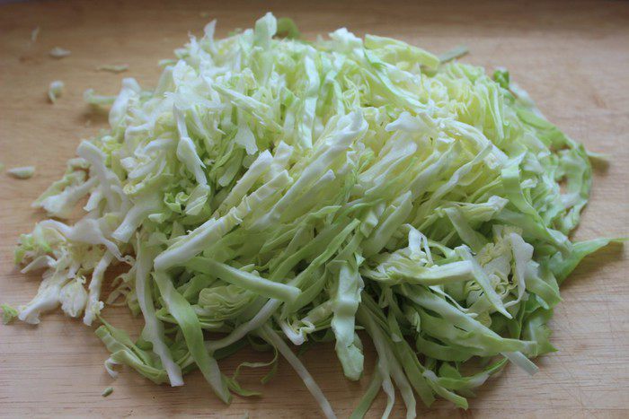 Для начинки мелко порубить небольшой кочан молодой капусты.