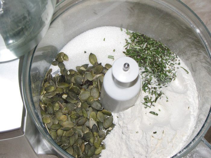 В чашу блендера всыпать просеянную муку, сахар, тыквенные семечки и мелко нарезанный свежий розмарин. Хорошо взбить, чтобы семечки измельчились.