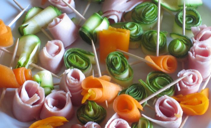 Овощи: цукини нарезать тонкими ломтиками с помощью овощечистки. Свернуть розочкой и скрепить зубочисткой. Из тонко нарезанной ветчины тоже сделать розочки и скрепить зубочисткой. Морковь отварить до полуготовности в кипящей воде, очистить овощечисткой, нарезать тонкими ломтиками, свернуть розочками и скрепить зубочистками. Каждый цветочек подрезать, чтобы они были одинаковой высоты.