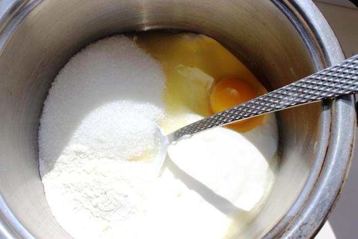 Хорошенько перемешать в кастрюльке сметану, 125 грамм сахара, яйца и муку.