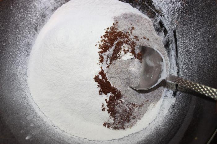 Просеять в миску муку и крахмал, добавить кофе и перемешать.