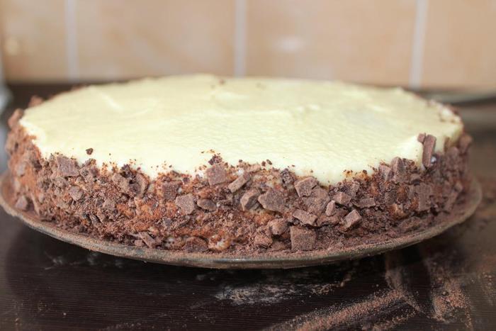 Смазать верх и бока торта кремом, бока обсыпать тертой или рубленой шоколадной стружкой.
