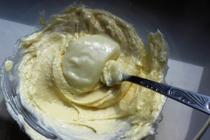 Масло необходимо заранее достать из холодильника, так как при смешивании сливочная и заварная части должны быть одинаковой температуры.
