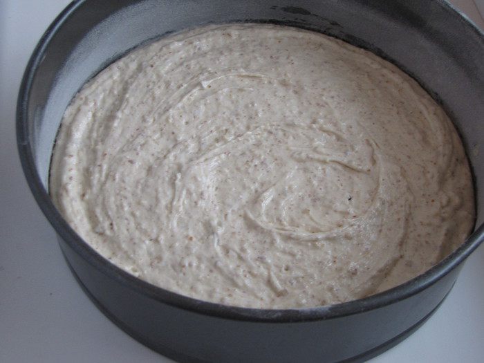 Духовку нагреть до 180 град. Форму для запекания смазать маслом и присыпать мукой. Выложить в подготовленную форму две трети теста.