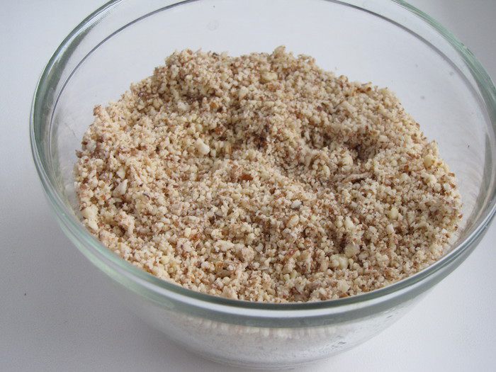 Смолоть орехи. По рецепту шел лесной орех, но у меня его не оказалось, поэтому взяла миндаль :-)