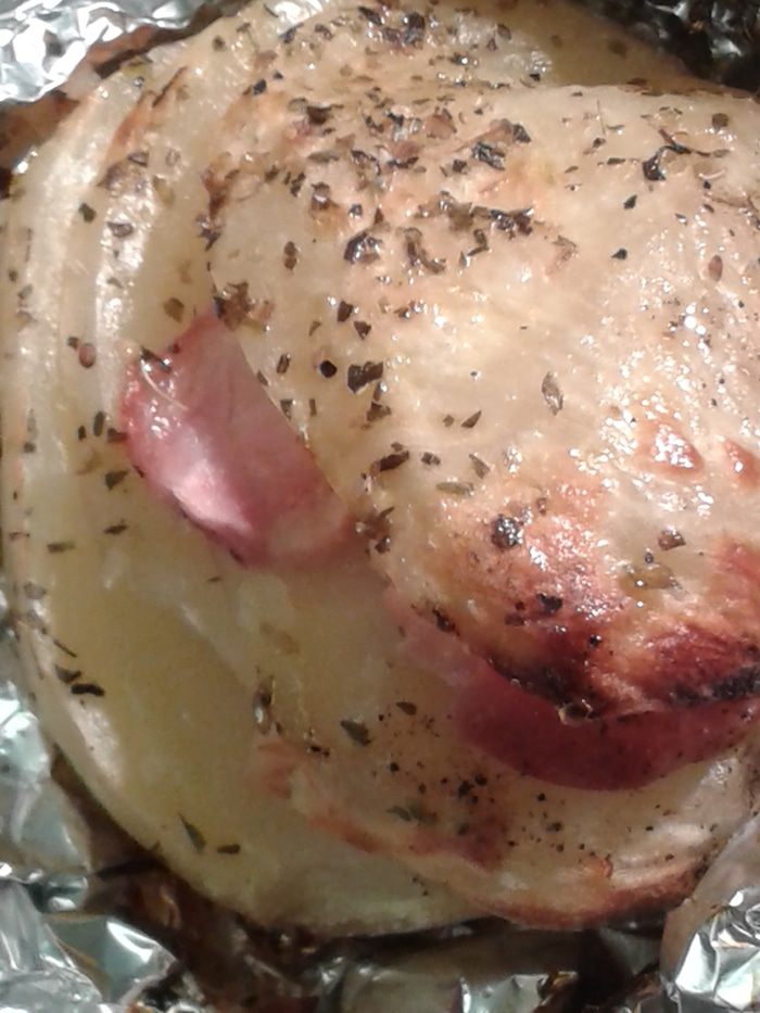 На картофеле сделать 3-4 глубоких надреза, но не до конца. Посолить (немного т.к. бекон может быть достаточно соленый), поперчить, между разрезами положить бекон, сверху немного взбрызнуть растительным маслом, посыпать сухими травами (травы могут быть любые базилик, орегано и т.д.).Как вариант можно положить листики свежего шафрана (на мой взгляд отличное сочетание).