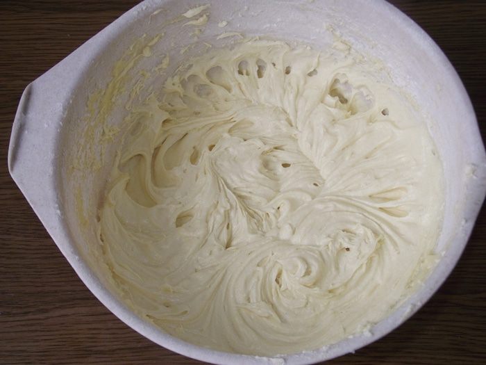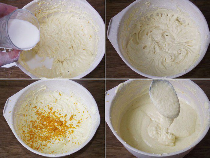 Добавить яйца, по одному за раз, взбивая несколько минут после каждого добавления. Добавить ванильный сахар. В отдельной миске смешать вместе муку, разрыхлитель и соль. По желанию можно добавить цедру. Теперь на низкой скорости, поочередно добавить смесь муки и молока, в три этапа, начиная и заканчивая мукой.