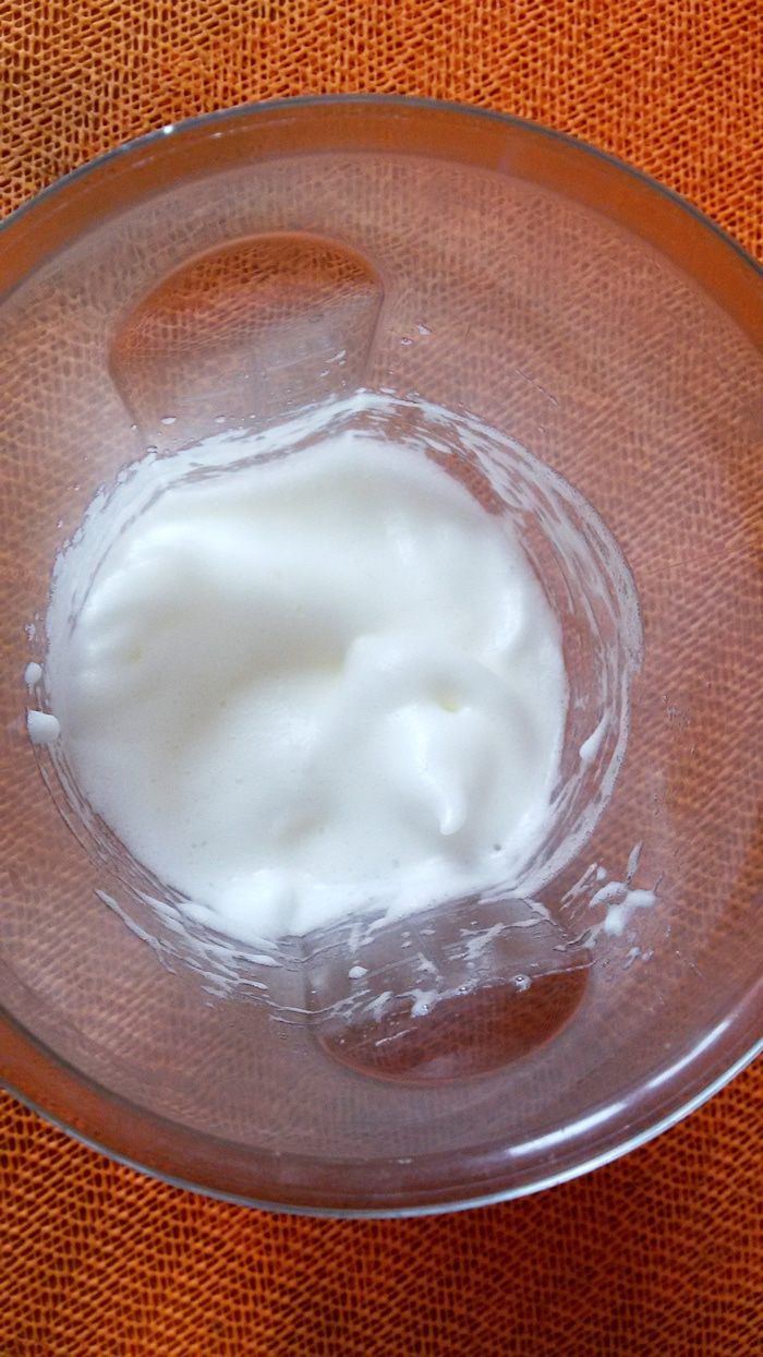 Белки от двух яиц взбиваем при помощи погружного венчика до устойчивых пиков. Перед взбиванием добавляем в белки щепотку соли.