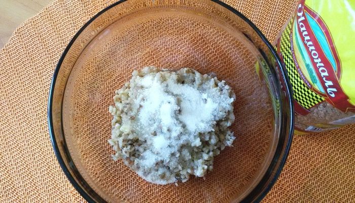 Соединяем в отдельной миске заранее приготовленную гречневую крупу ТМ «Националь» с сахаром (в том числе и ванильным) и мягким сливочным маслом.