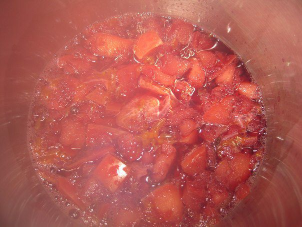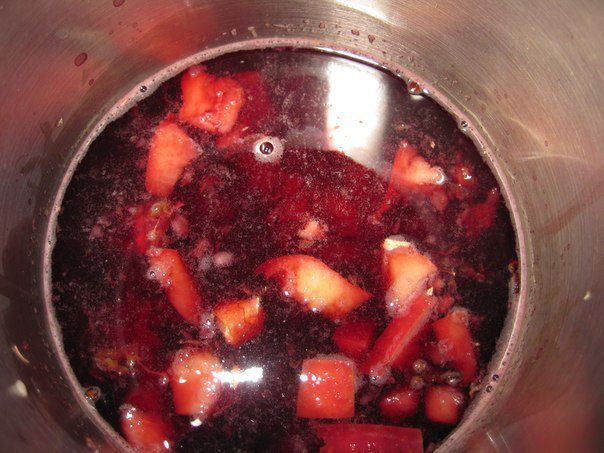 Влить вино. Подогревать на медленном огне, время от времени помешивая, доводя вино почти до кипения. Но не доводить до кипения.