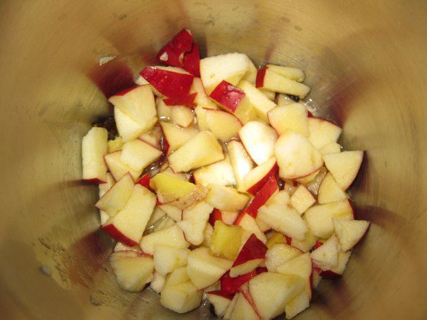 Яблоки помыть и нарезать на кусочки. В сотейник или кастрюлю с толстым дном и стенками на дно налить чуть-чуть воды. Выложить нарезанные яблоки и порезанный мелко имбирь. Подогревать на медленном огне.