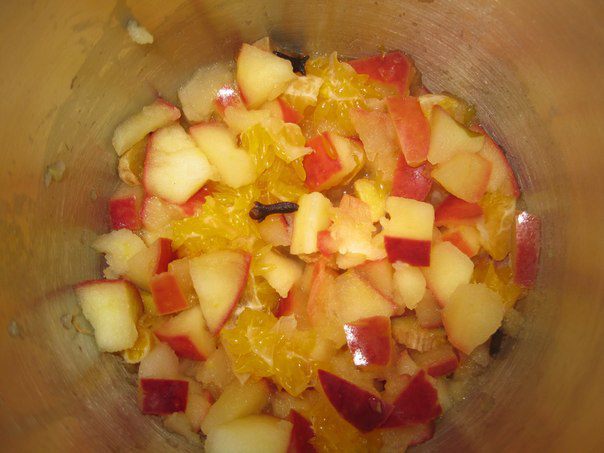 Порезать мандарин, добавить гвоздику, корицу и коричневый сахар. Сахар можно заменить медом. Помешать.