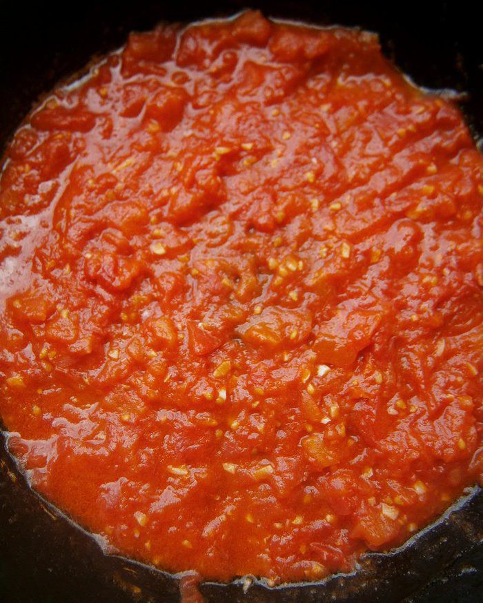 В сковороде раскалить 2 ст. л. растительного масла, добавить нарезанные помидоры, чеснок и готовить, помешивая, 2 - 3 минуты.