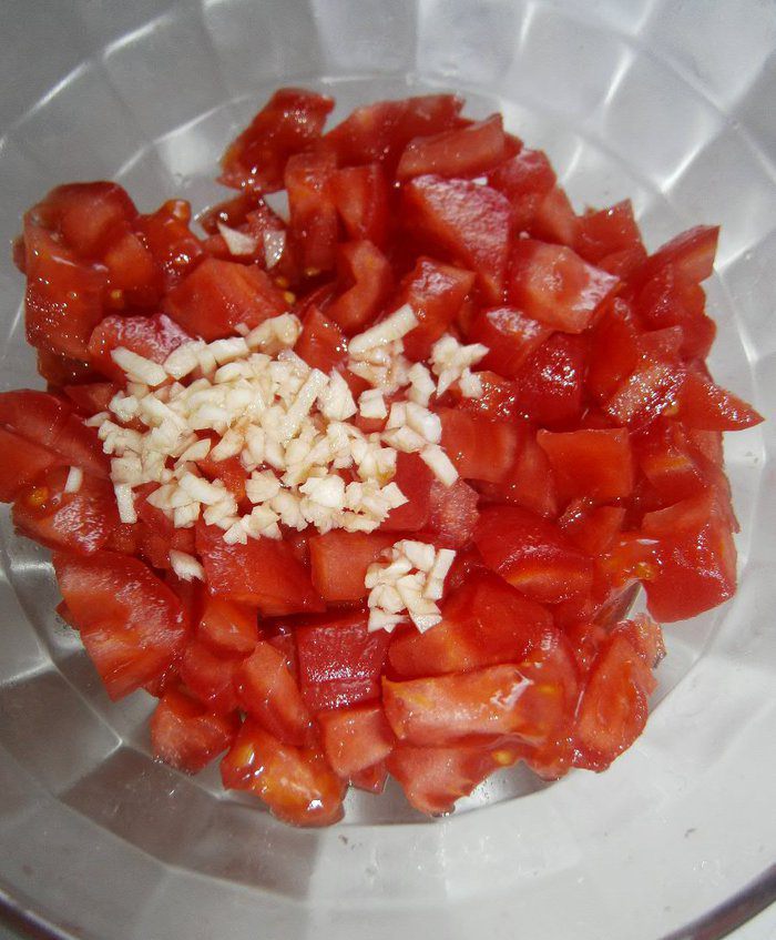 Томаты бланшировать, снять кожуру. Нарезать небольшим кубиком. Чеснок мелко нарезать. Куриное филе нарезать на порционные кусочки.