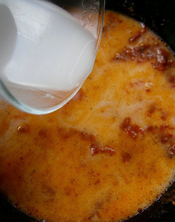 Затем добавить соль, смесь перцев по вкусу, сахар. Влить кокосовое молоко, перемешать, и готовить ещё 2 минуты.