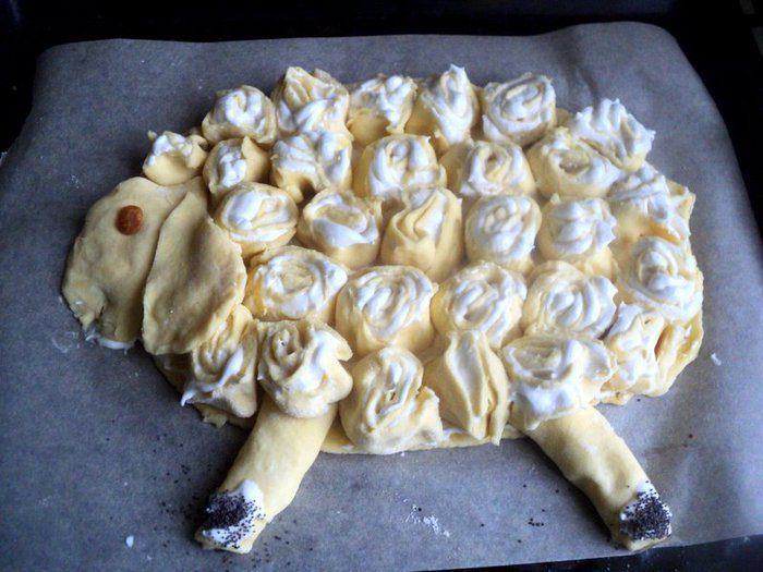 Выложить рулетики в виде барашка на основу. Из кусочка теста вылепить головку и ухо овечки, из тонких рулетиков, смазанных белковым кремом, ножки. Копытца посыпать маком.