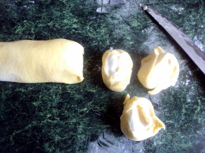 Свернуть пласт рулетом, защипнуть края и порезать кусочками толщиной 1.5 см.