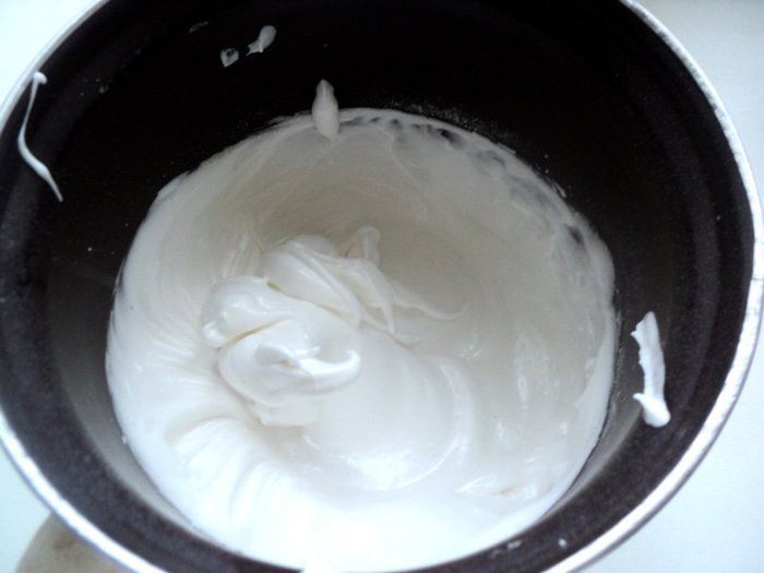 Охлажденные белки взбить в крепкую пену, добавив в конце 5 ст.ложек сахарной пудры и ванильный сахар.