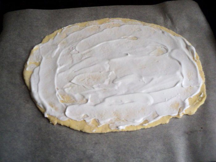 Отделить от теста 1/4 часть и раскатать в овал толщиной 5-6мм и выложить на противень, застеленный бумагой для выпечки. Смазать пласт белковым кремом. Это будет основа тела овечки.