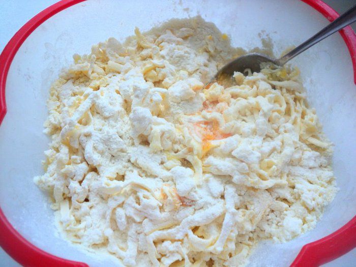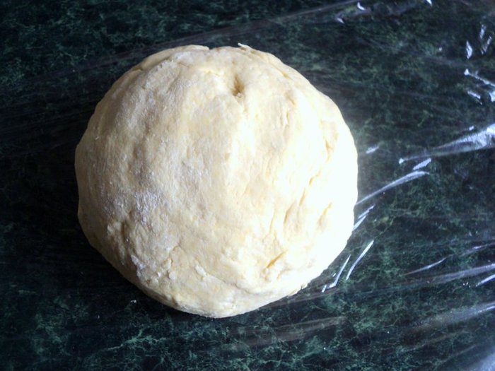 Быстро замесить тесто, скатать в комок, завернуть в пищевую пленку и поместить в холодильник на 1 час.