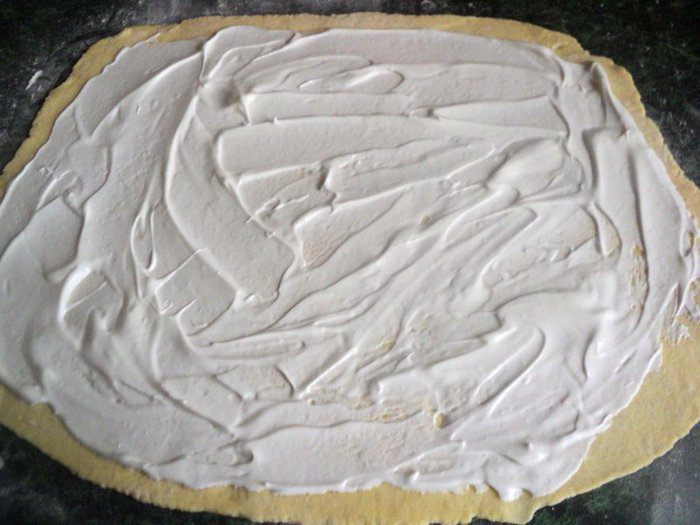 Отделить от теста небольшой кусочек для головы и ножек овцы, остальное тесто раскатать в пласт толщиной 5 мм, смазать белковым кремом.