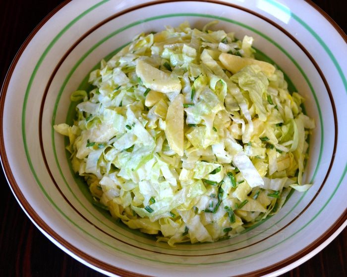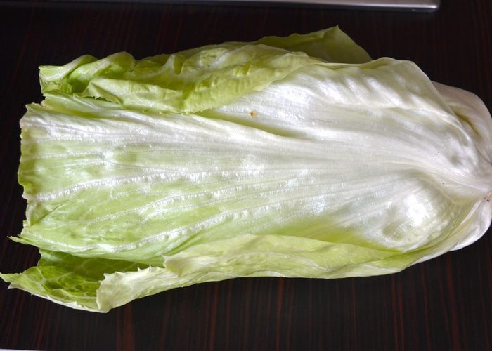 Нам потребуется вот такой вид кочанного салата... К сожалению, не знаю, как он называется по-русски. Внешне и по вкусу он является чем-то средним между пекинской капустой и салатом Айсберг.