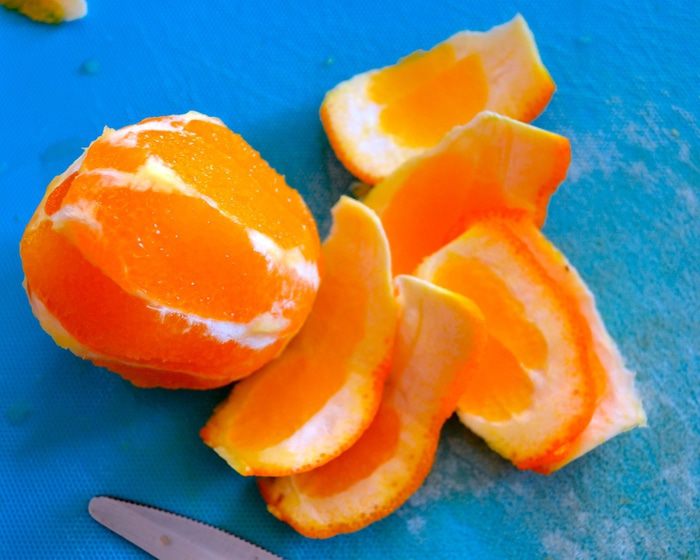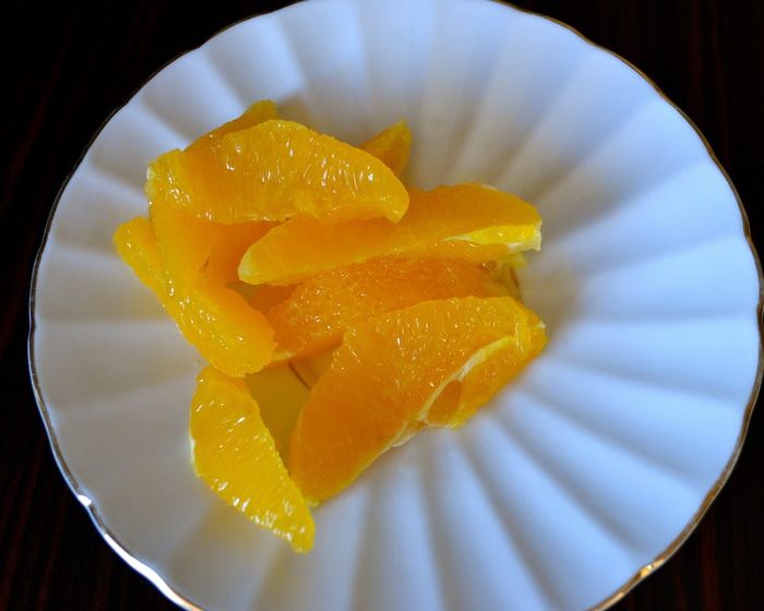 Вырезать ножом дольки апельсина, прорезая ножом на границе между пленкой и мякотью фрукта. У нас получатся вот такие дольки без пленочек.