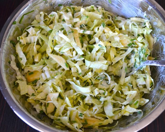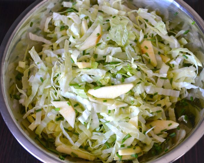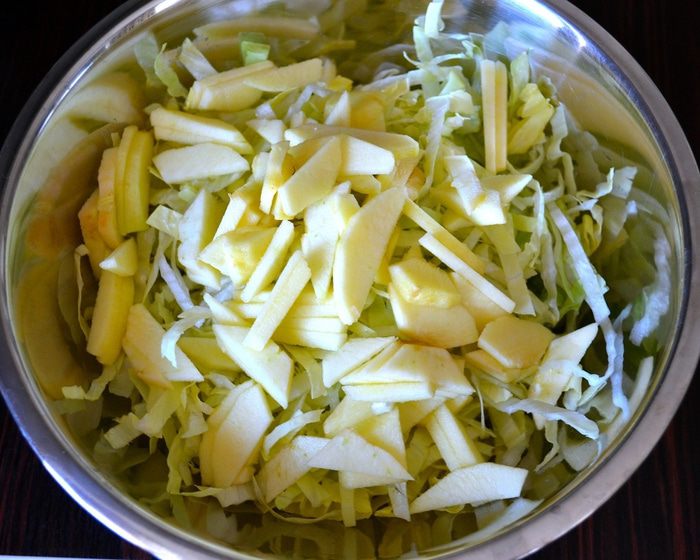 Яблоко очистить от кожуры и нарезать не очень мелко. Добавить к салату.
