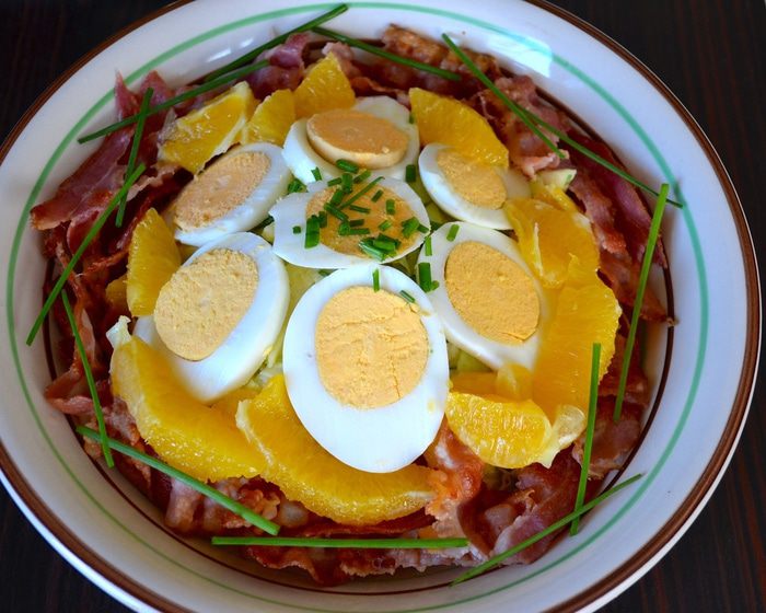 Поверху выложить нарезанное кружочками яйцо. Ниже выложить дольки апельсина. А основание салата выложить беконом, поломанным на кусочки. Я украсила салат "стрелками" шнитт-лука. Очень вкусно и нетривиально!