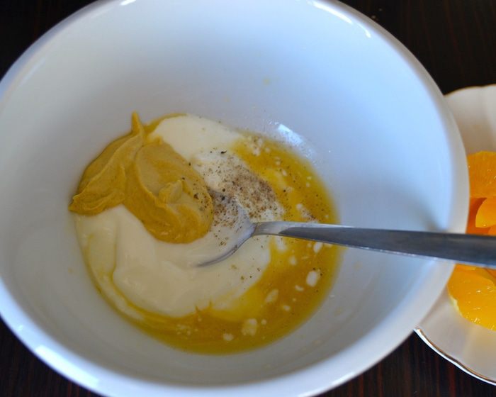В небольшой миске собрать 2 ст.л. апельсинового сока (выжать остатки от апельсина и использовать сок с разделочной доски), добавить сметану, горчицу, соль и свежемолотый перец. Перемешать соус-заправку.