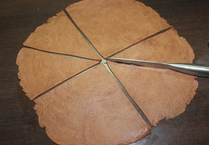 Раскатываем тесто в тонкий пласт и режем его на 8 секторов.