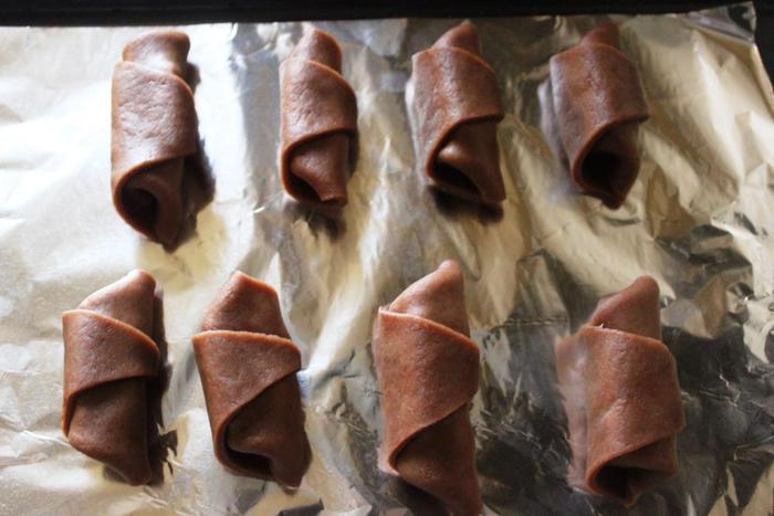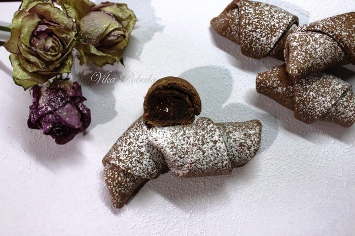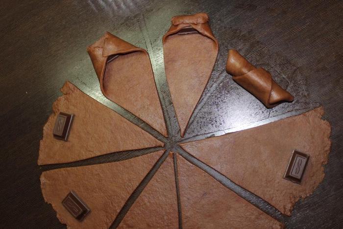 На широкий край выкладываем кусочек шоколада, загибаем края к центру и сворачиваем в рулет к узкому краю.