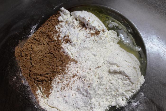 Разогреваем духовку до 180 градусов. Соединяем в миске масло, минеральную воду, муку, столовую ложку с горкой какао и ванилин.