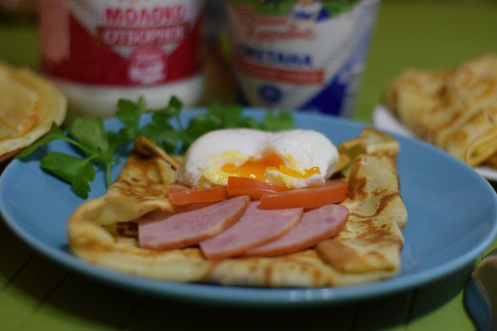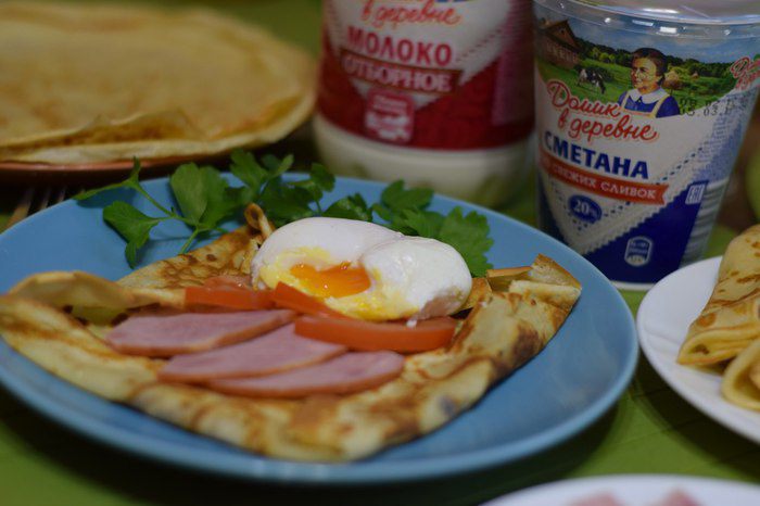 Иногда завтрак должен выглядеть именно так. Нежный блин + ветчина, яйцо пашот, помидор и зелень.