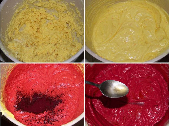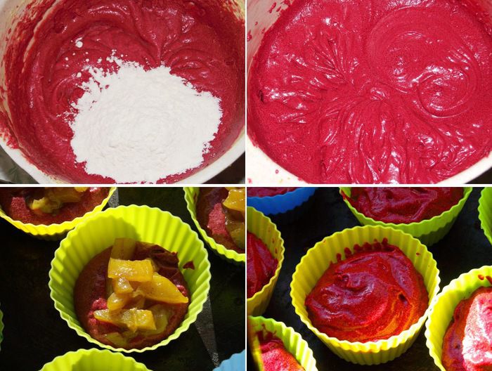 Оставшиеся сухие ингредиенты смешать вместе и просеять. Постепенно на медленной скорости поочерёдно в три приема добавить сухие ингредиенты и в два смесь кефира и масла. Цвет у теста должен быть не красным, не розовым и не бледно розовым. Цвет должен быть бордовым! Если не так, то добавьте побольше краски. Равномерно заполнить тестом подготовленные формочки, добавить тыкву и снова накрыть тестом. Выпекать в течение примерно 17 — 20 минут. Проверить на готовность можно зубочисткой. Вставленная в кекс, она выходит чистая. Даем кексам полностью остыть.