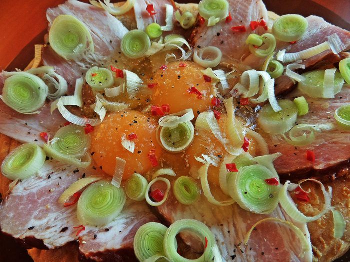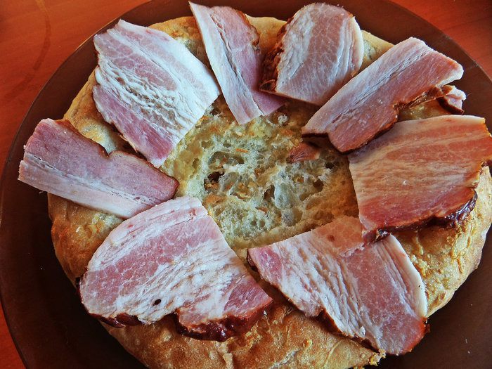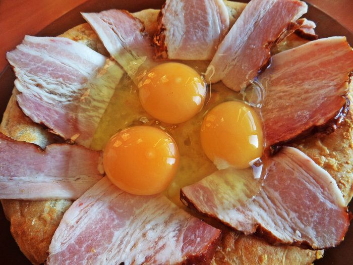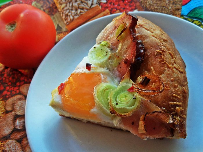 Что приготовить из вчерашней сырной лепёшки (купила в частной пекарне), которую уже не хочется просто так кушать? На выручку пришла такая идея: яичница-"глазунья" с беконом, такое на завтрак любят все мужчины)))