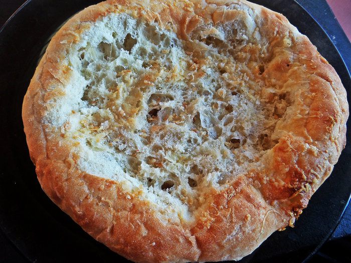 Так как лепёшка была размером с тарелку,хватает на 4 человек по кусочку.