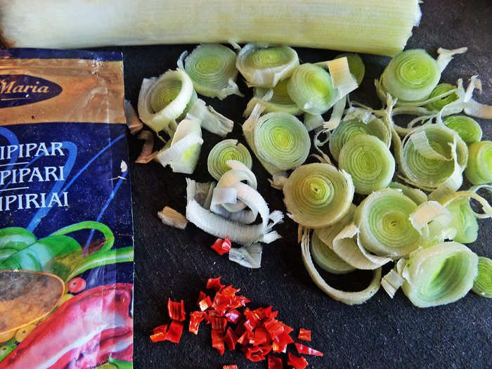 Порей нарезать на колечки,кусочек чили измельчить.
