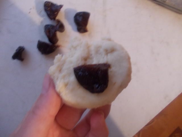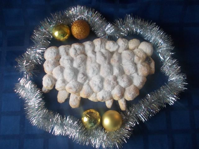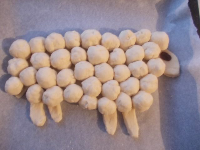 Каждый шарик укладываем вместо шерсти на барашка. Не забывайте,что тесто будет расти,поэтому скатывайте шарики и укладывайте так,чтобы они потом не разрослись по всему противню,делайте на треть их меньше,чем хотите получить в конечном итоге. Глаз я сделала из изюма,можно из орешка. Смазать взбитым яйцом и отправить в разогретую духовку 190С. ока не появится золотистая корочка.