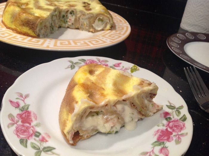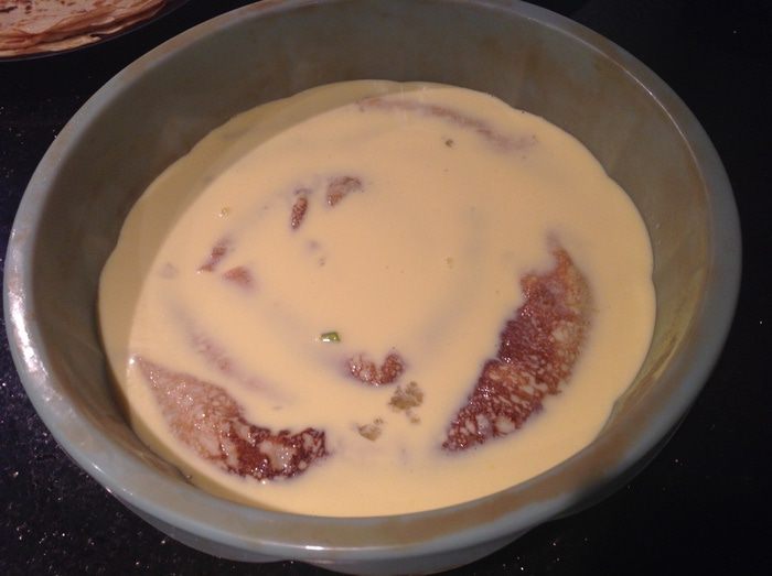 Залейте блины яичной смесью, выпекайте в предварительно нагретой до 160 градусов духовке 45 минут.