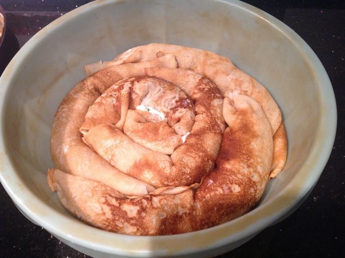 Положите блины в форму для запекания, по кругу, начиная с середины.