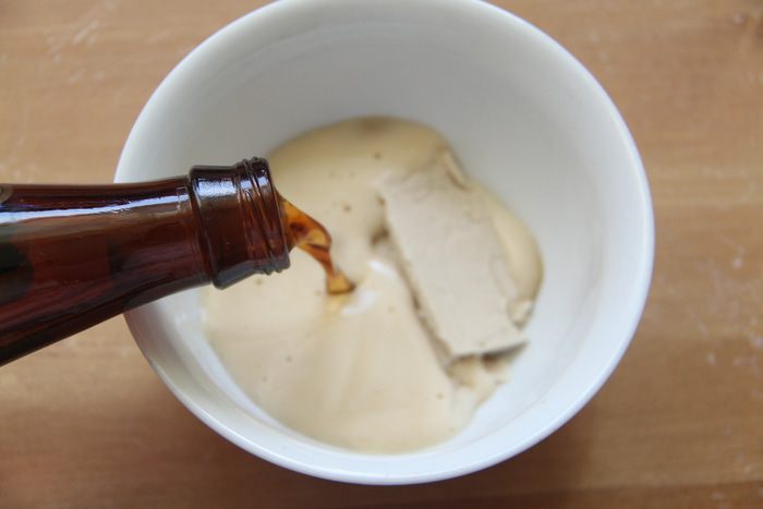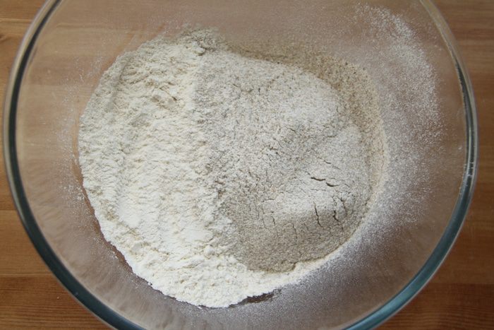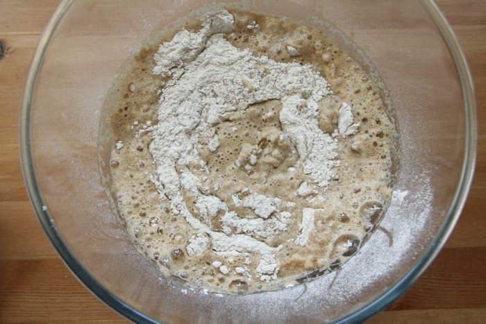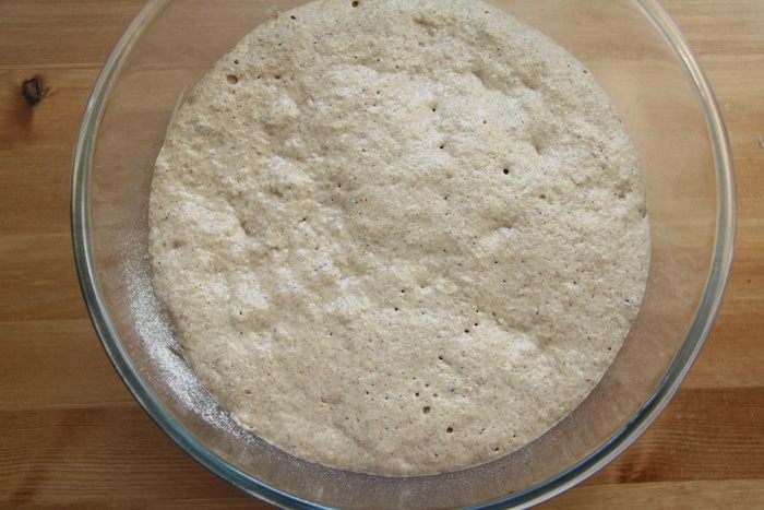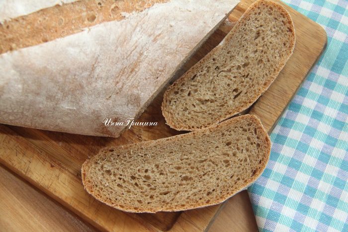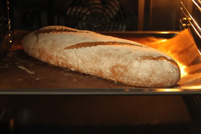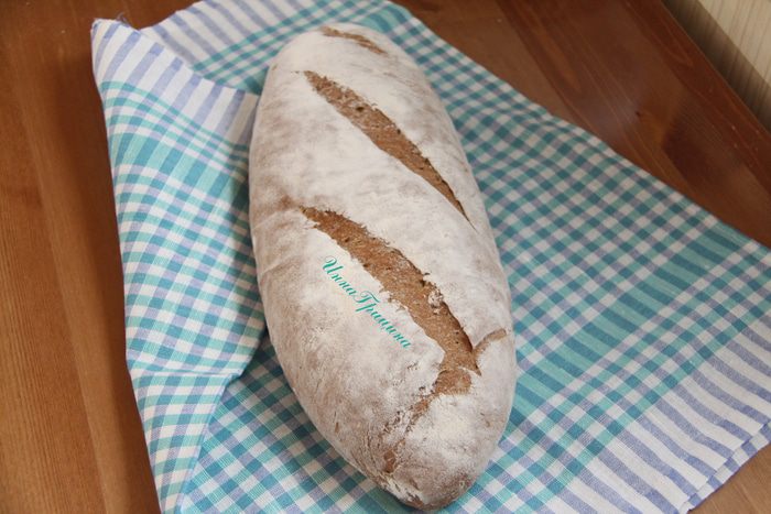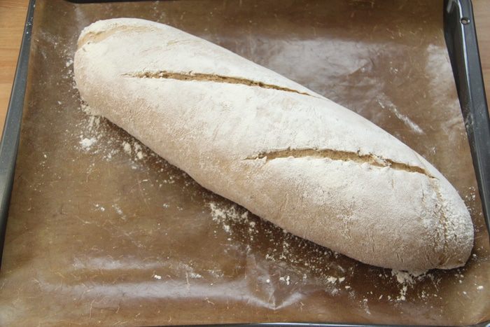 Выложить тесто с помощью скребка на присыпанный мукой стол, сформировать батон (сначала тесто расплющить в прямоугольный пласт, затем свернуть рулетом), уложить на антипригарный лист, накрыть полотенцем и оставить на 1,5 часа до увеличения хлеба в объёме вдвое.