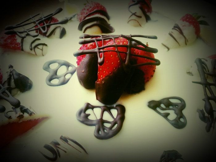 Коржи смазать кремом и полить глазурью. Торт украсить клубникой и шоколадом.