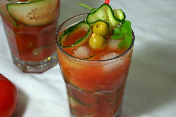 Выливаем томатный коктейль в стакан, украшаем маслинами, огурцом и веточкой кинзы...