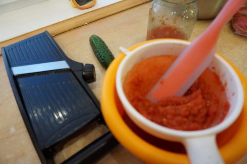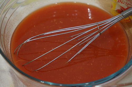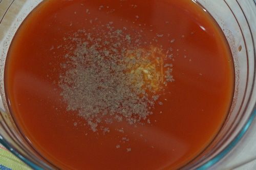 Томатный сок, из домашней заготовки, протереть через сито отделяя от грубых кусочков мякоти и семечек.